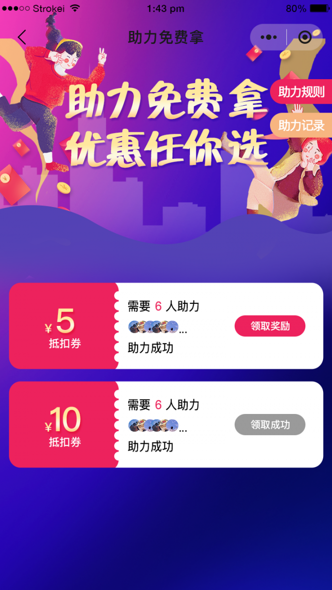 功能介紹:拉新利好!參與助力的用戶,只要邀請到規定的人數為ta助力,即可獲得相應的抵扣券或折扣券,在訂單支付時可以抵扣相應的現金。