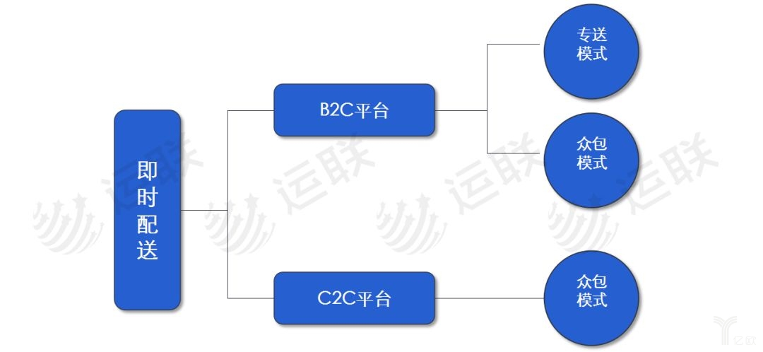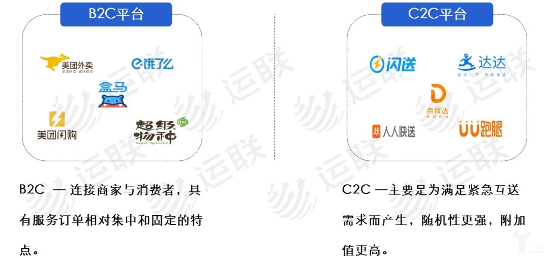 即時配送行業(yè)最終面對的客戶都是C端消費者,從經(jīng)營模式上看,即時配送行業(yè)的企業(yè)整體可歸為B2C、C2C兩大類。從各自的運營模式來看,B2C中又包含專送模式和眾包模式兩種,而C2C只有眾包模式。從資產(chǎn)模式的角度看,即時配送行業(yè)的企業(yè),都是以輕資產(chǎn)模式切入,通過平臺形式進行運作,通過數(shù)據(jù)系統(tǒng)建立龐大的運力群體,支撐其龐大的C端客戶需求。在運力組成模式上,當前多數(shù)企業(yè)都采用了的運力眾包模式,通過APP端吸納社會閑散運力,構(gòu)成平臺的運力池。