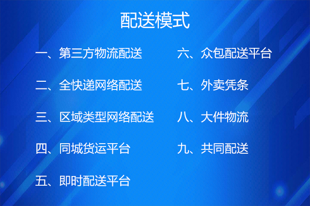目前,配送大體分為全快遞網(wǎng)絡配送、第三方物流配送、即時配送平臺、區(qū)域型網(wǎng)絡配送、同城貨運平臺、大件物流服務平臺、眾包配送平臺、外賣平臺、共同配送。